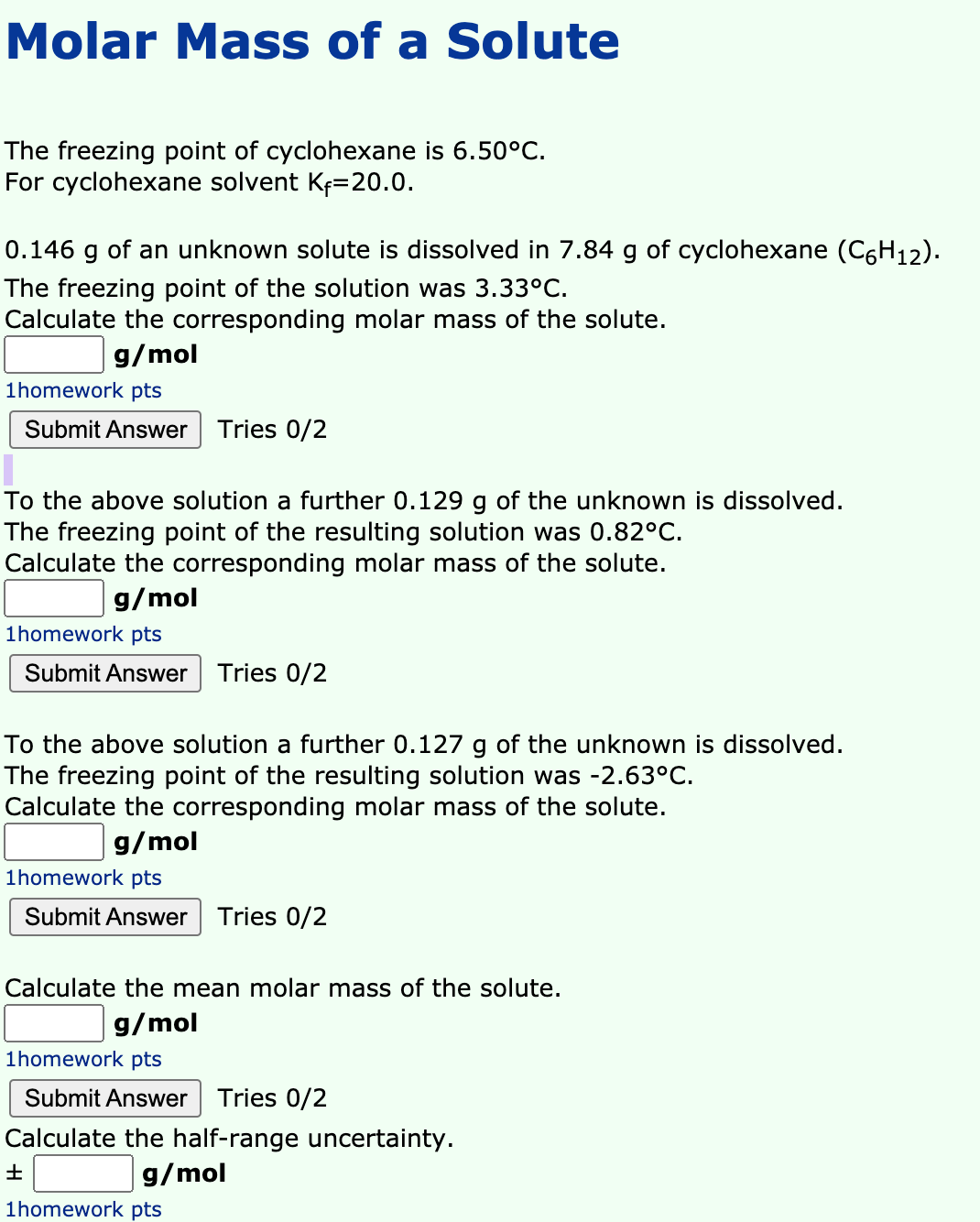 H 2g18g x 100 111 O 16g18g x 100 889. Lab 7 - Determination of the Molar Mass of an Unknown Solid by Freezing Point Depression Goal and Overview In the first part of the lab a series of solutions will be made in order to determine the freezing point depression constant K f for cyclohexaneThe freezing points of these solutions which will contain known amounts of p-dichlorobenzene dissolved in cyclohexane will be measured. Also important in this field is Avogadros number N.